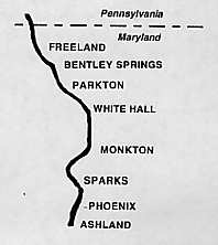 After passing through the village of Monkton, the Northern Central Railroad continues northward through the abandoned villages of Pleasant Valley and Bluemount toward White Hall, a distance of approximately 3.5 miles.
