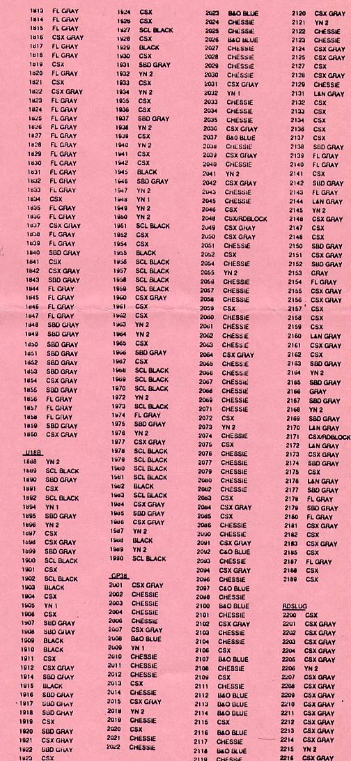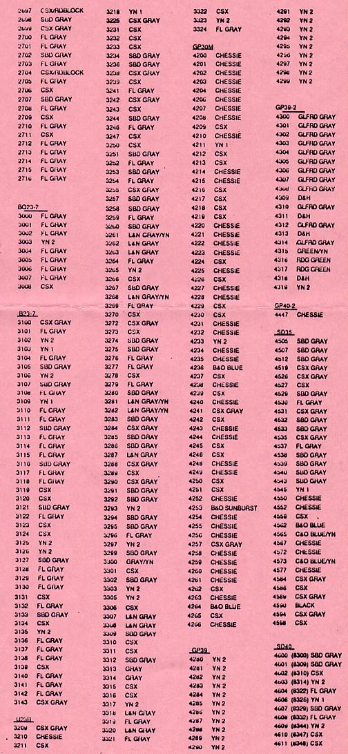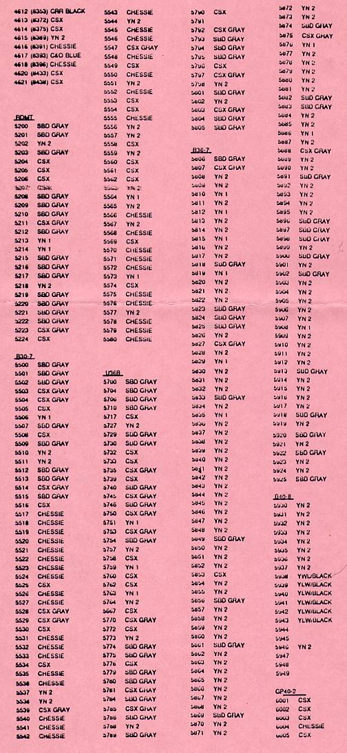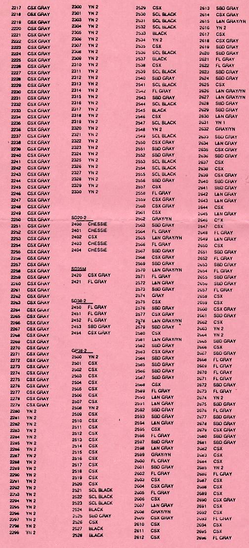 Included here is the semi-annual update of CSX locomotive paint schemes. Much assistance in preparing this list has been rendered from various sources: Robert Michaels of Howell, Michigan, who compared information from the list he maintains; Mario Hendricks of Greenbelt, Maryland, who transferred the list to computer; and to a number of alert spotters around the system who have furnished their own sightings. It is a continuing effort.