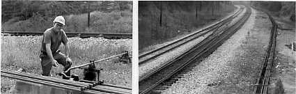 Photos, above.. Signal maintainer Dave Wood (left) points to a device called a 'crank' which redirects the motion of the pipeline in its function of throwing switches manually from within Miller Tower. Pipeline networks can extend several hundred feet, and might not even be in a straight line (as shown in the photo from the tower's west window above, right). In spite of this, levers are usually rather easy to operate. This is due to regular maintenance, plus the mechanical advantage offered by a lever moving three feet to move a switch by only four inches.