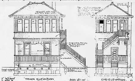 Present-day Miller Tower was constructed to a standard plan dated August 23, 1911, drawn by the B&O's office of architect for a frame signal tower structure size 15 X 21 feet. Other frame towers of that period followed a similar plan and were variously larger or smaller depending upon the amount of workspace that was needed. A number of these towers survive today. A noticeable architectural feature of this plan is the shingled extension just beneath the top floor windows of the building. Some of the surviving towers from this plan have more recently had this extension removed in favor of siding modifications.