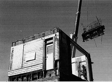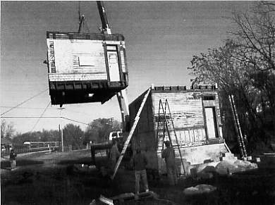 Second floor being hoisted for placement atop the first floor [photo by Doug Koontz]
