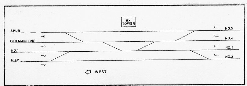 The operator at HX Tower controlled six crossovers and eight signals at its interlocking, the number needed to effect moves connecting four tracks running east and west, directly in front of the tower. In addition, one power crossover and one switch were remotely controlled from HX Tower at a location known as Curtis Bay Junction, three miles to the east (see diagrams). The tracks numbered 3 and 4 respectively were the same tracks at and between both locations. Both tracks had bidirectional signaling. A code-type model board was in place at HX Tower for the operator to control the switches and signals at Curtis Bay Junction. East of Curtis Bay Junction were three tracks - one to Curtis Bay (which became two tracks a short distance further east), and two tracks into the yard at Mount Clare. The yard tracks were designated B Lead (a tangent extension of No. 3 track) and A Lead (a tangent extension of No. 4 track). References to these tracks were often used interchangeably - B lead as No. 3 track, A lead as No. 4 track - but properly their names changed at the junction.