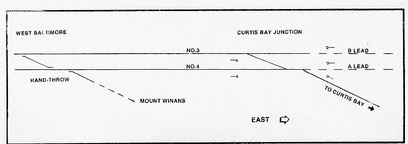 Note once again the diagrams shown above... The train was on No. 4 track. The only power-operated switch that I controlled at Curtis Bay Junction was oriented in the wrong direction for a train to proceed eastward on No. 4 track into Mount Clare on B lead. A train, if short enough to fit between the hand-throw crossover at West Baltimore and the eastward signal at Curtis Bay Junction, could make a backup move through the hand-throw crossover onto No. 3 track and then proceed east on B lead. Or it could proceed east on No. 4 track to Curtis Bay Junction and toward Curtis Bay far enough to clear the junction, and I could then reverse the power crossover and give the train the signal to back onto No. 3 track at that location. Either move would require the permission of the train dispatcher (obtained from me after I asked him). But all this became a moot point, as things developed; the Baltimorean came on the bell (our expression to describe the train entering the tower's approach circuit), and it was routed eastward onto No. 3 track at HX Tower.