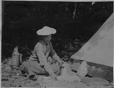 SUNDAY, JULY 22. The Broughams, accompanied by the last suit case full of "duffel," tin lantern, and various articles of value to the commissary department, arrived at the canoe house about eleven A.M. At noon, having stowed away our goods in our good canoe (and wept to see how few these were), we embarked safely and were most enthusiastically sped upon our way by our affectionate brother and sister, who had stationed themselves on the bridge at the subway station, thoughtfully provided with a camera. Arrived at the mouth of Spuyten Duyvil Creek without adventure and with favoring wind against the tide crossed to the Jersey shore and thence passed by disheartening numbers of campers out. With no place observable to pitch our tent, from sheer weariness, we attempted a landing and ran upon a sunken rock. The canoe careened, shook, shivered her timbers, then nobly righted herself and hung, nose on, two feet from the shore. With straining paddles and perspiring noses we pried off and resolved to go in bathing, which H.B.B. did, and for sundry reasons N.I.H.B. did not. Then we became aware that we had no camping permits, from a sign posted by the Secretary of the Interstate Park Commission, but conscious of our deserts and nothing deterred, we again took to the shallow water and faring past innumerable other camping tents we found ourselves at a point nearby opposite Yonkers. There we staked out a squatters claim and proceeded to preempt it, with the following improvements, to wit: N.I.H.B. & H.B.B., one tent, lamely erected (it did not come up to specifications) and plentiful stores, supplies, provisions, etc., also water-proofing (and thereby hangs a tale, for on the first night of our camping experience it rained). Then did we rejoice that we had with us ponchos, rubber blankets, a rain coat and woolen blankets withal wherewith to guard against the moisture that freely penetrated our frail habitation (the sides of the tent cleated down to within six to eight inches of the ground where H.B.B. slept, safely covered by a poncho). N.I.H.B. reposed upon an army cot...... After bath and supper at once to bed and to sleep, amid the murmurs of the drizzling rain, and the song of the festive mosquito.