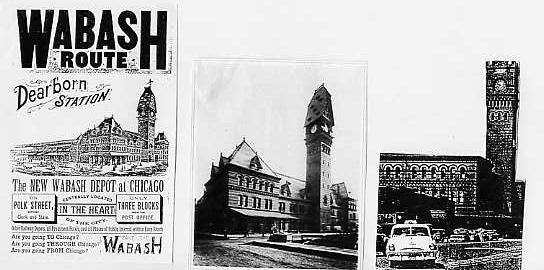Above left - The Wabash, St. Louis & Pacific Railway, a tenant company of the Dearborn Street Station, issued this advertisement shortly after the completion of the station. This shows a detailed view of the east wing including the train shed roof and baggage handling areas to the south of the main building. [From collection of the Chicago Historical Society]