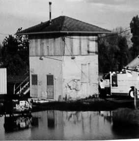 Elvas Tower (SP), Sacramento, California. Now owned by California RR Museum. Tower was planned to be moved to RR Technology Museum at former SP Sacramento Shops, but likely it will be demolished with a new structure eventually replicating the old one instead. Photo of old structure taken February 2001 through window of the California Zephyr.